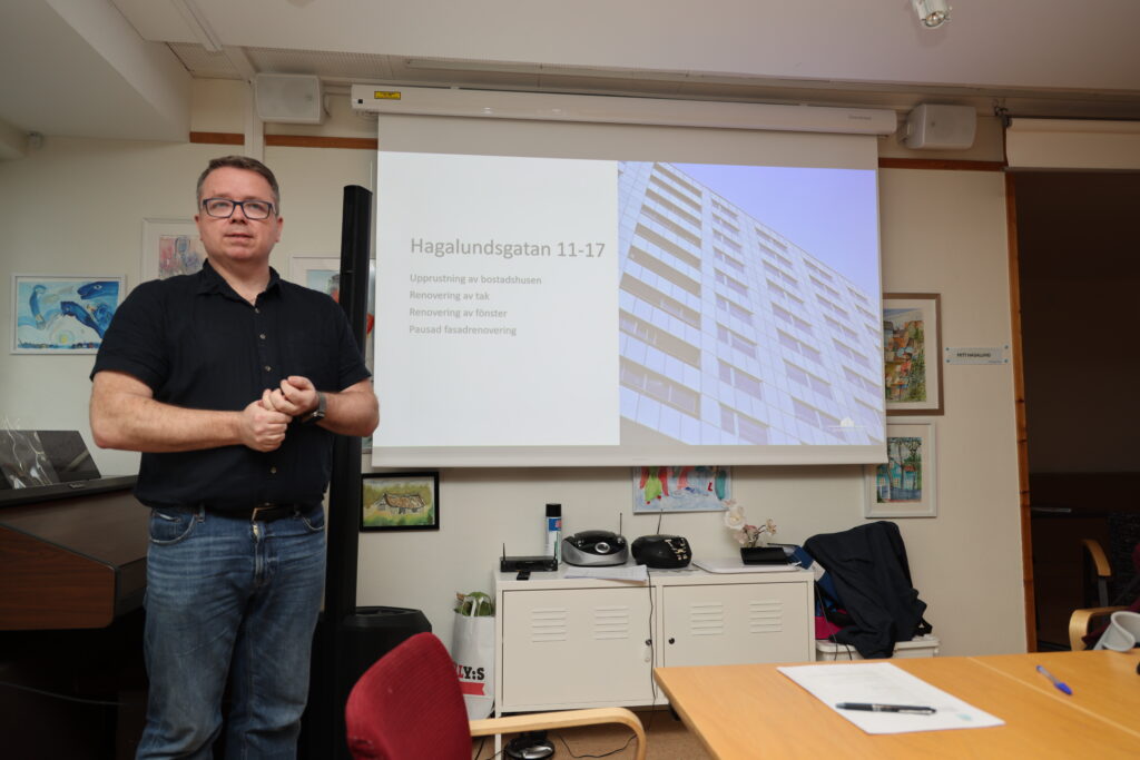 Föreningens ordförande Monica Eriksson invigde mötet, därefter berättade Jimmy Blomqvist Larsson, ordförande i Signalisten, om de pågående planerna i Hagalund. Vi fick bland annat veta mer om det nya centrumet, den planerade temalekplatsen samt vad som händer med fasadrenoveringarna av de blåa husen i Signalistens bestånd.